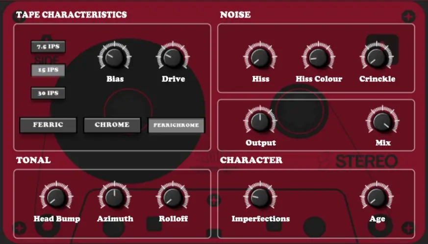 Tonal Shaping Section: Head bump, azimuth misalignment, high-frequency rolloff, and stereo output level—everything you’d find in a real analog deck.