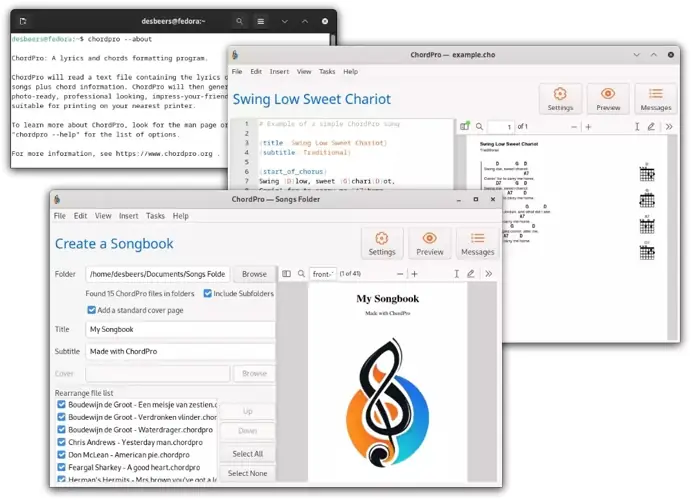 This program implements ChordPro language version 6. It is the successor of Chord and Chordii with additional features such as native PDF generation, Unicode input and fully customizable layout, fonts and sizes.