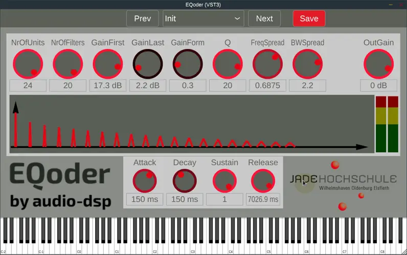 The name EQoder is a wordplay between EQ and Vocoder, since you have to use it like a vocoder but the effect is a modulated cascaded Equalizer. In its resulting function it is an amplifying comb-filter.