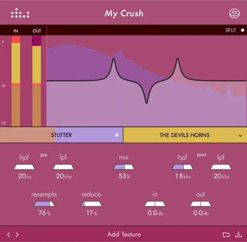 The cool thing about My Crush is that it gives you really precise control over how you mess up your sound. You get separate knobs for reducing bits and changing the re-sampling rates, plus there are six different graph curves you can use to instantly change the texture of whatever you’re working on. they built-with high-pass and low-pass filters too, so you can shape your sound before or after you process it. Oh, and there’s this sweet beat-synced stutter slider that lets you create all these rhythmic glitches and textures.