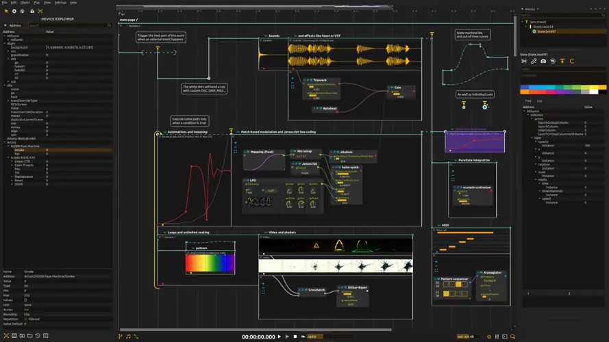 Sequence OSC, MIDI, DMX, sound, video and more, between multiple software and hardware. Create interactive and intermedia scores, script and live-code with javascript, ISF Shaders, Faust, PureData or C++. Leverage IoT protocols such as CoAP or MQTT, interact with joysticks, Wiimotes, Leapmotions, Web APIs and BLE sensors and integrate programs from a wealth of creative programming languages such as Structure Synth, Context-Free Art and Bytebeat. Load any kind of audio or video format and process visuals through Spout, Syphon, NDI, Shmdata or Sh4lt.
