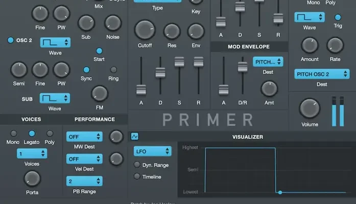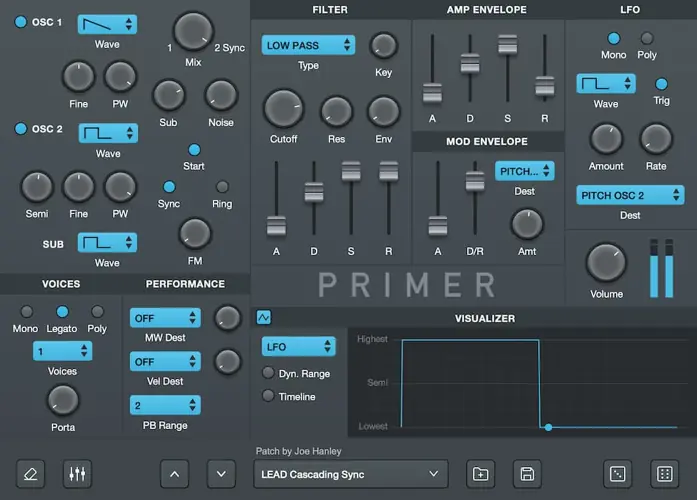 Primer is a synth built for learning. Designed for Syntorial (the award-winning synthesizer training app), it contains the most common controls found on most subtractive/analogue synths, allowing for a wide variety of patches and sounds, while presenting a simple and easy-to-understand interface and layout.